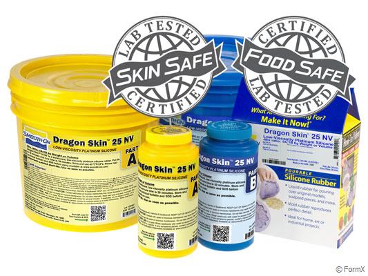 Properly cured Dragon Skin™ 25 NV complies with 21 CFR 177.2600 "Rubber articles intended for repeated use" for use with dry food and aqueous food only. This material has been tested by an independent laboratory to comply with 21 CFR 177.2600(e), water extractable limits for repeated use in aqueous food. This material is not intended for repeated use in contact with fatty foods.