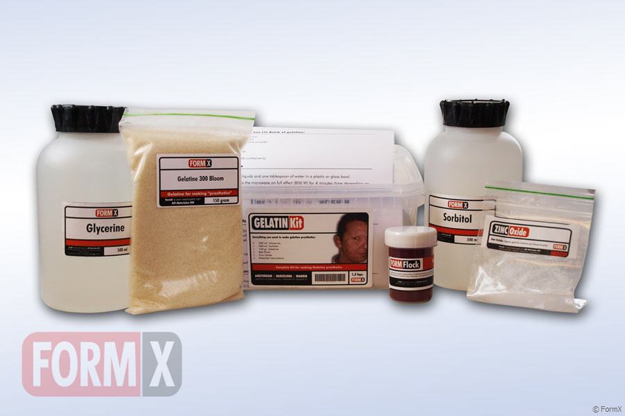 Gelatin Kit, All You need to make 1 kg. of prosthetic Gelatin. Kit contents: 500 ml Glycerine, 500 ml. Sorbitol, 150 gr. Gelatine, Red Flock, Zinc Oxide, detailed instructions.