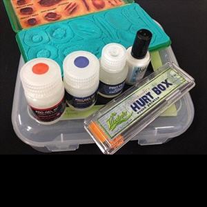 1 Hurt Box Kit including: 1xHurt Box Original Platinum Silicone Mould 1x Hurt Box Wound 5 Colour Illustrator palette 1x Translucent Powder 1x Telesis Beta bond plus 1/2oz 1x Pro Gel 10 A + B ProGel 1x Pro Plastic Bald Cap Encapsulator