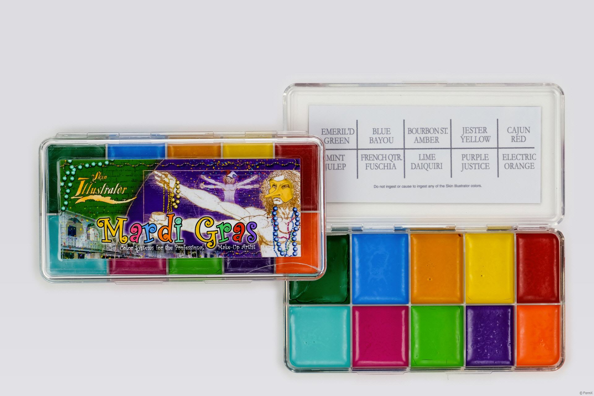 This unique collection of colorful pigments was designed for creating clowns, mimes, tattoos, and the psychedelic 60's and 70's. The bright exotic colors are perfect for carnival and festival body and face painting. The Mardi Gras Palette can be used with any other Skin Illustrator palette to create your own new colors and shades. Colours include: Emeril'd Green, Blue Bayou, Boubon St. Amber, Jester Yellow, Cojun Red, Mint Julep, French Qtr. Fuschia, Lime Daiquiri, Purple Justice, Electric Orange.