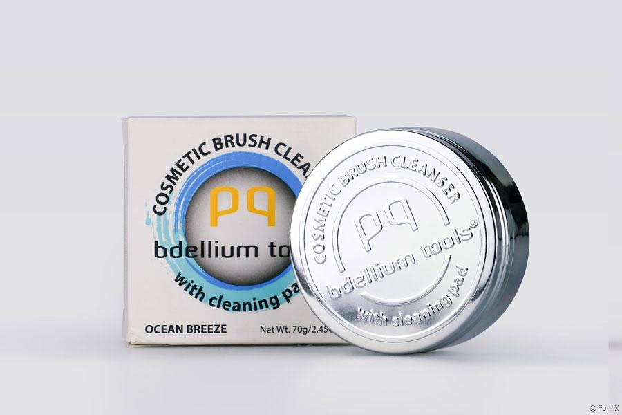 Wet brushes in warm water. Swirl in soap to a lather. Work the bristles of your brush back and forth on the silicone cleaning pad (located in cap) to remove makeup residue. Rinse and repeat as necessary. Squeeze out excess water and lay brush flat to dry. Allow soap to dry completely before storing away.