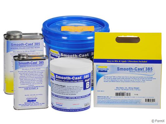 Smooth-Cast™ 385 is a mineral filled urethane casting resin that is very hard and durable. When Parts A and B are mixed in proper proportion (1A:5B by weight), Smooth-Cast™ 385 cures at room temperature with virtually no shrinkage. This rigid urethane casting resin has high compressive and flexural strength. Fully cured castings are tough, machinable and paintable.